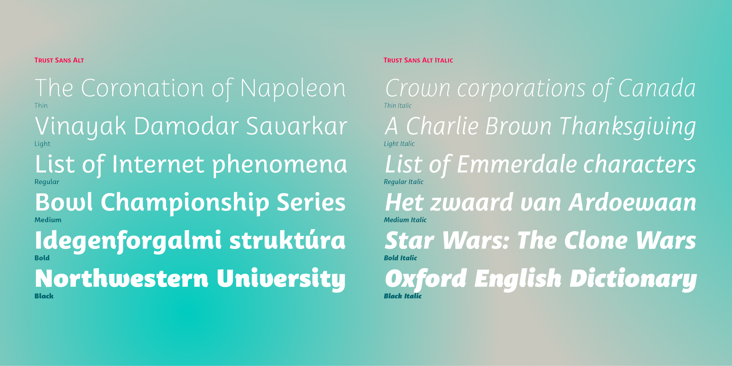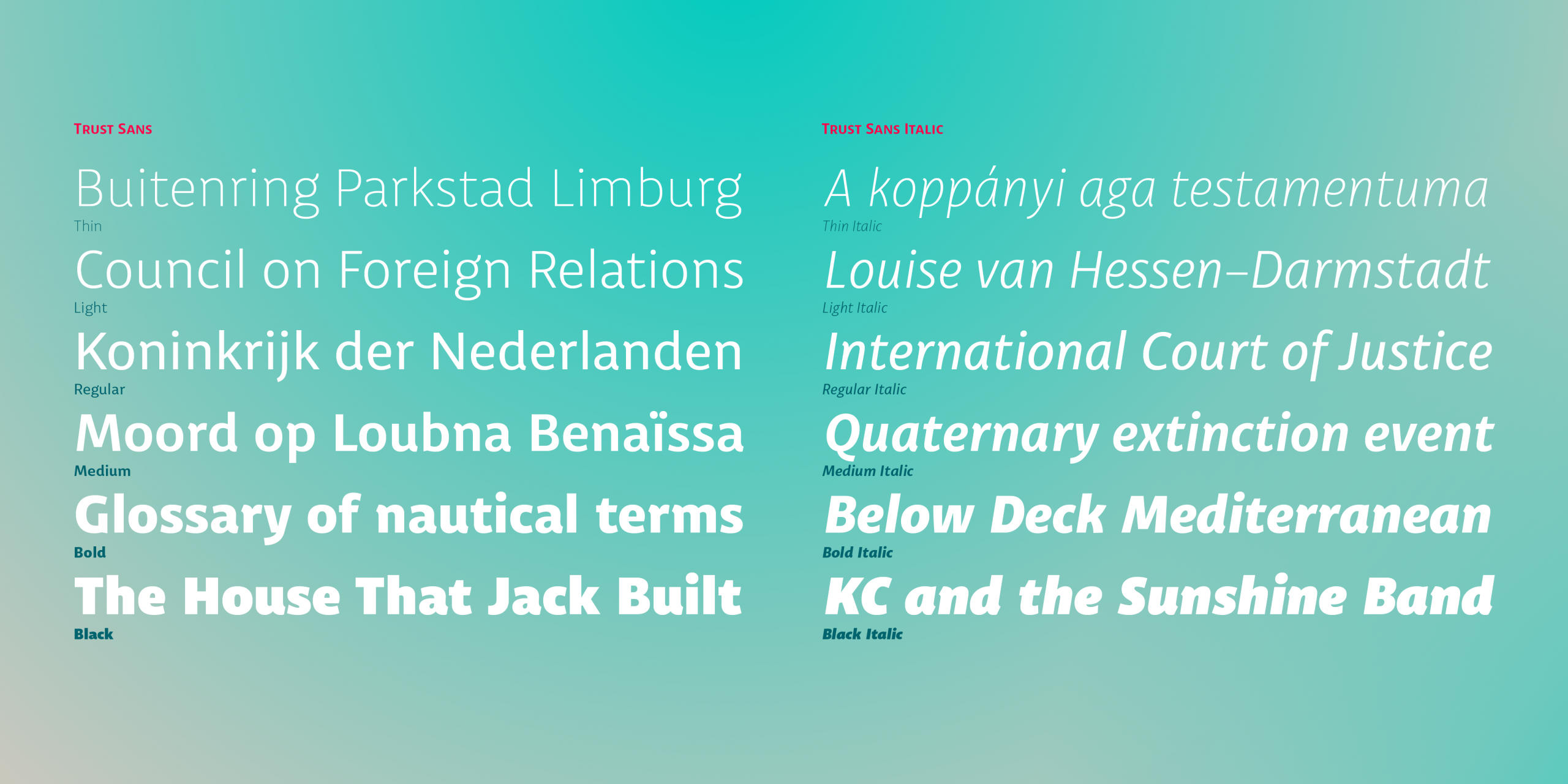 This typeface comes in a variety of weights-perfect for creating an effective typographic hierarchy-and includes an extensive character set, including small caps, various numerals, case-sensitive forms, context-sensitive and discretionary ligatures, and more. The family’s glyph set supports more than 200 Latin-based languages. Trust Sans is composed of two complementary subfamilies: the standard, more formal, and the alternative, more casual. Each family comes in 6 weights, from thin to black, with matching true italics. All of these features make Trust Sans an ideal typeface for a wide range of applications, including editorial design, immersive text, corporate identity, branding, and packaging.